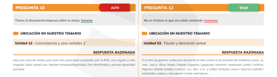 El informe del examen de ingreso en la Guardia Civil incluye el razonamiento de todas las respuestas correctas y también la explicación de por qué las incorrectas lo son. Además, distribuye las preguntas en tres niveles de dificultad (alto, medio y bajo) y señala dónde puedes encontrar la respuesta en el Temario Inteligente de Serás.